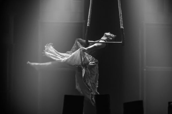 No palco, o corpo se torna linguagem. Com o uso do trapézio, o artista cria imagens que transitam entre queda e permanência, construindo metáforas sobre instabilidade, sobrevivência e urgência ambiental.